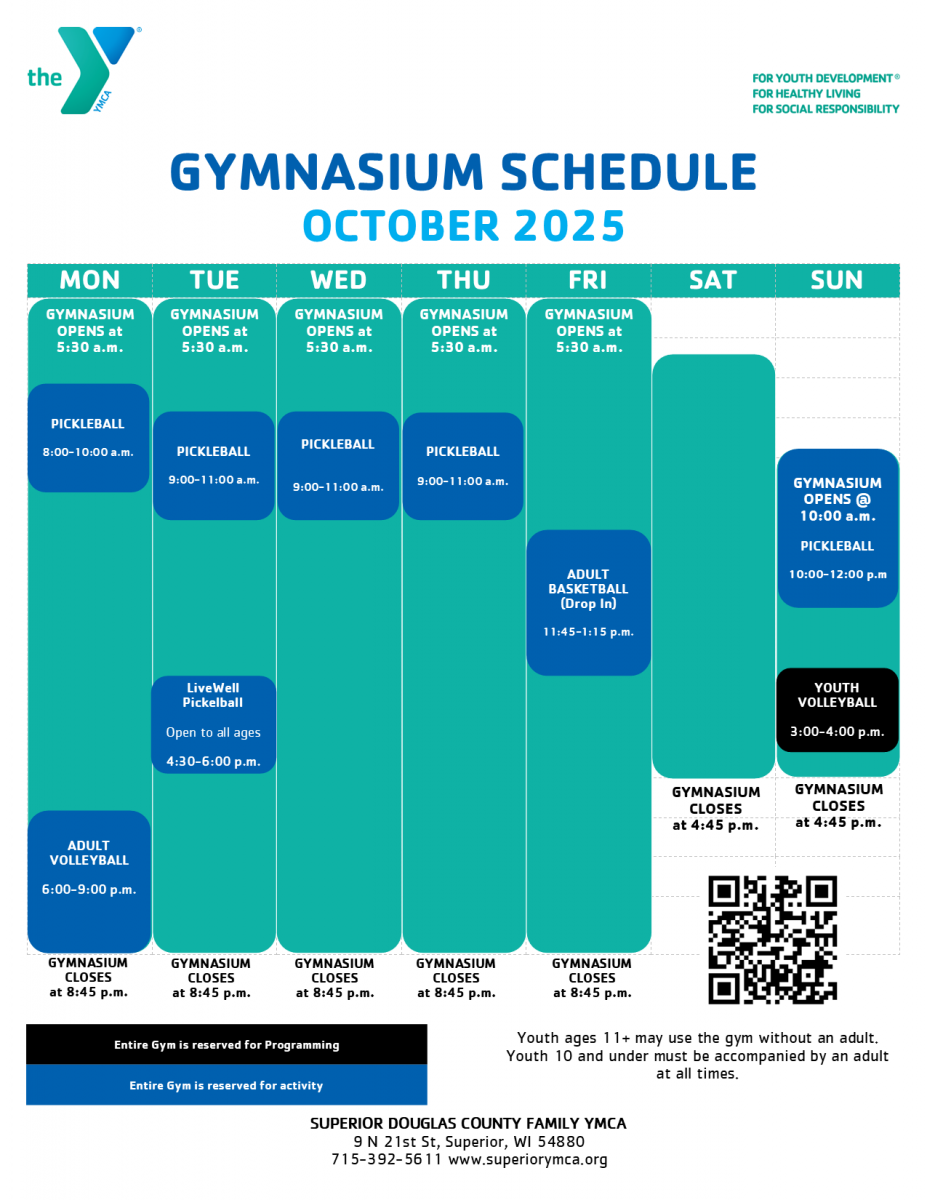 Youth ages 11+ may use the gym without an adult. Youth 10 and younger must be accompanied by an adult at all times.